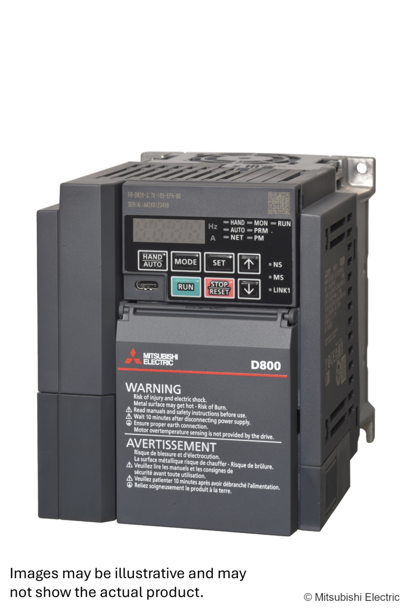 Serija FR-D800 predstavlja kompaktne, zanesljive in energetsko učinkovite frekvenčne pretvornike proizvajalca Mitsubishi Electric, zasnovane za upravljanje trifaznih motorjev v najrazličnejših industrijskih in komercialnih aplikacijah. Z napredno tehnologijo in enostavno uporabo so pretvorniki FR-D800 idealna izbira za ventilatorje, črpalke, transportne trakove in avtomatizacijo ostalih pogonskih sistemov.